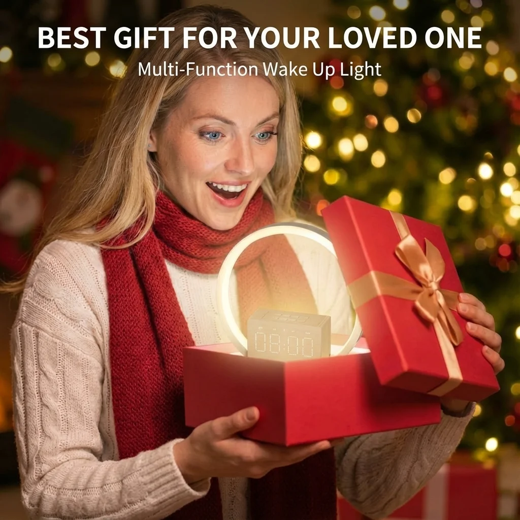 1Natural Sunrise Wake-Up: Gradually brightens over 30 minutes with 20 adjustable light intensity levels to mimic sunrise, paired with 5 built-in nature sounds (birds, ocean, etc.) for a gentle awakening experience