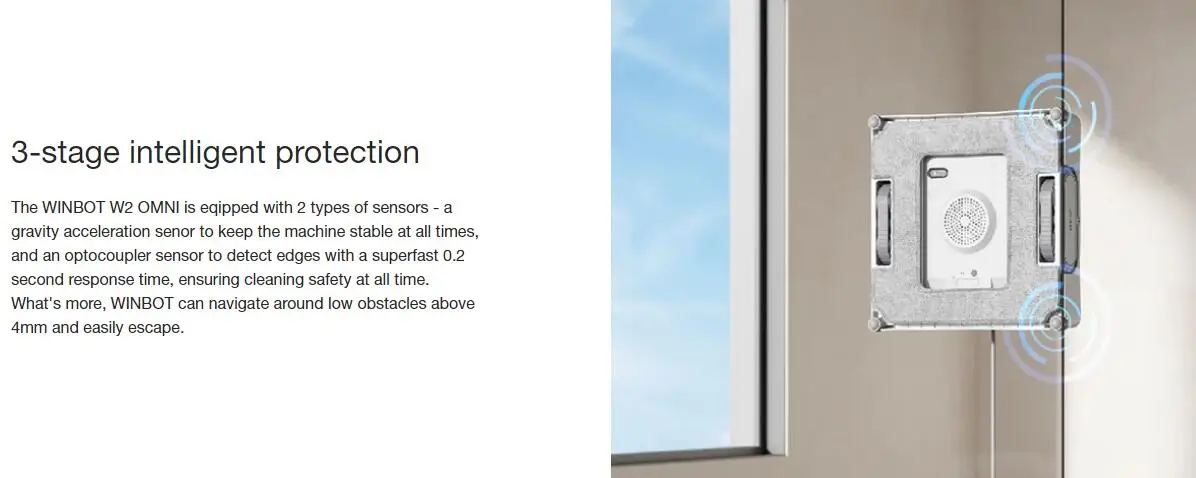 The WINBOT W2 OMNI is eqipped with 2 types of sensors - a gravity acceleration senor to keep the machine stable at all times, and an optocoupler sensor to detect edges with a superfast 0.2 second response time, ensuring cleaning safety at all time. What's more, WINBOT can navigate around low obstacles above 4mm and easily escape.