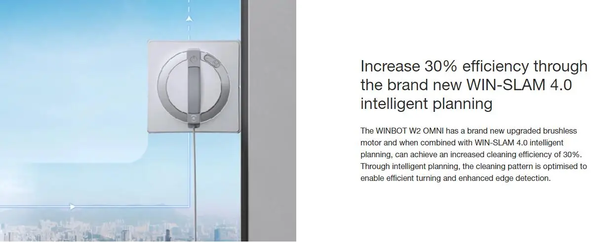 The WINBOT W2 OMNI has a brand new upgraded brushless motor and when combined with WIN-SLAM 4.0 intelligent planning, can achieve an increased cleaning efficiency of 30%. Through intelligent planning, the cleaning pattern is optimised to enable efficient turning and enhanced edge detection.