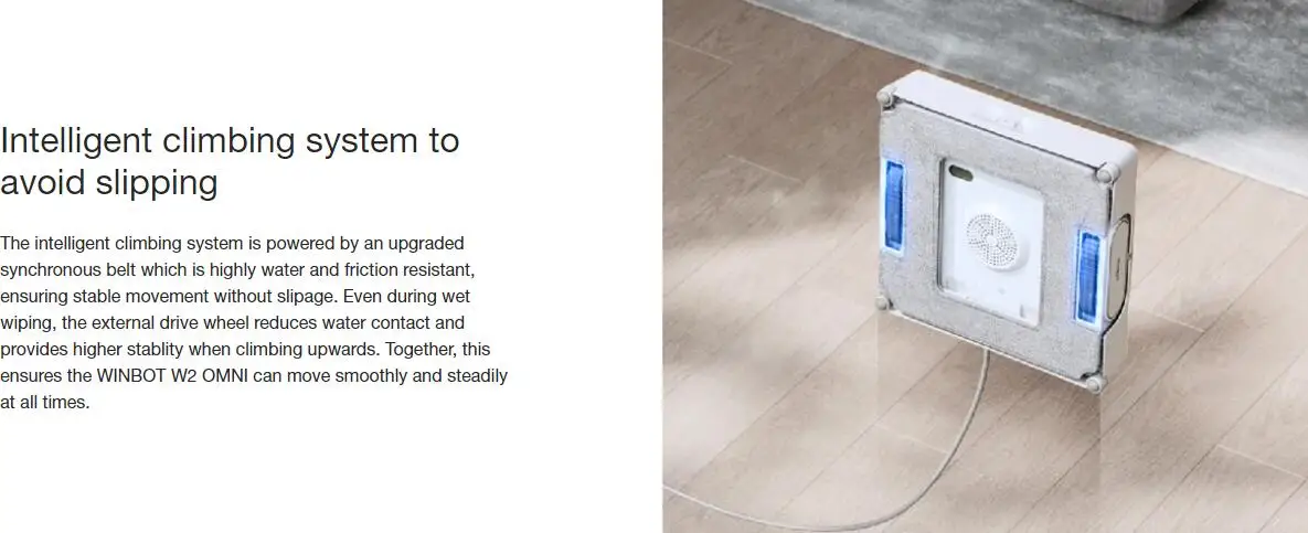 The intelligent climbing system is powered by an upgraded synchronous belt which is highly water and friction resistant, ensuring stable movement without slipage. Even during wet wiping, the external drive wheel reduces water contact and provides higher stablity when climbing upwards. Together, this ensures the WINBOT W2 OMNI can move smoothly and steadily at all times.