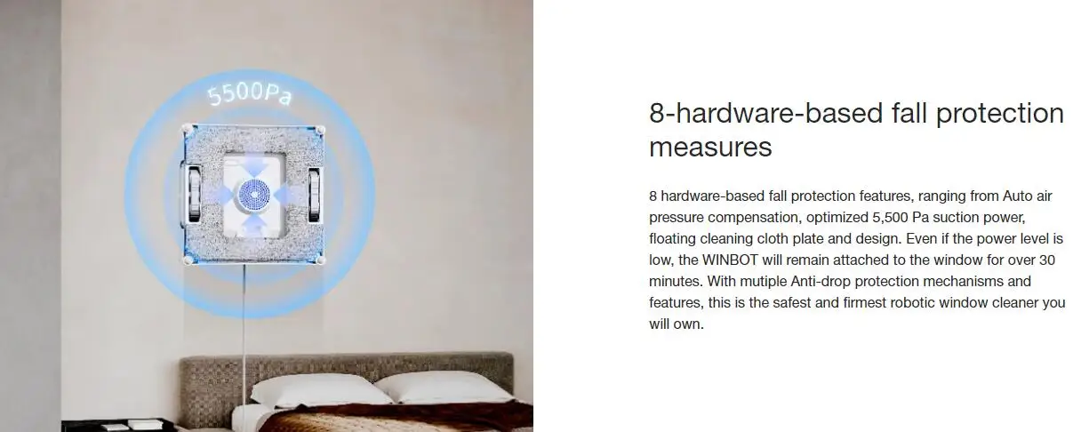 8 hardware-based fall protection features, ranging from Auto air pressure compensation, optimized 5,500 Pa suction power, floating cleaning cloth plate and design. Even if the power level is low, the WINBOT will remain attached to the window for over 30 minutes. With mutiple Anti-drop protection mechanisms and features, this is the safest and firmest robotic window cleaner you will own.