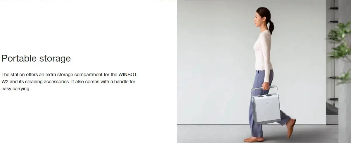 The station offers an extra storage compartment for the WINBOT W2 and its cleaning accessories. It also comes with a handle for easy carrying.