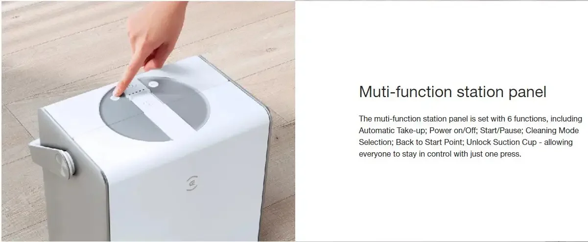 The muti-function station panel is set with 6 functions, including Automatic Take-up; Power on/Off; Start/Pause; Cleaning Mode Selection; Back to Start Point; Unlock Suction Cup - allowing everyone to stay in control with just one press.