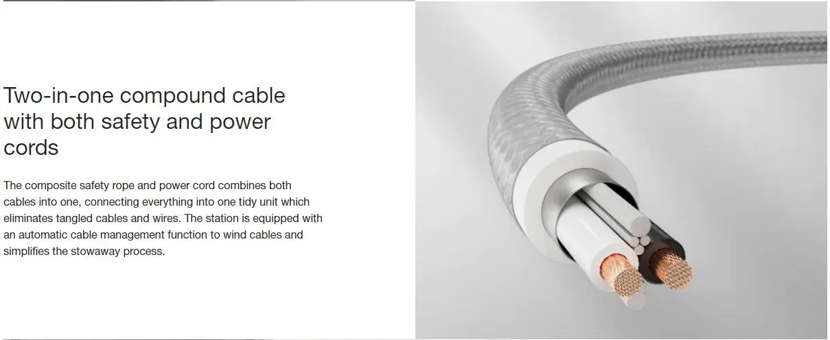 The composite safety rope and power cord combines both cables into one, connecting everything into one tidy unit which eliminates tangled cables and wires. The station is equipped with an automatic cable management function to wind cables and simplifies the stowaway process.