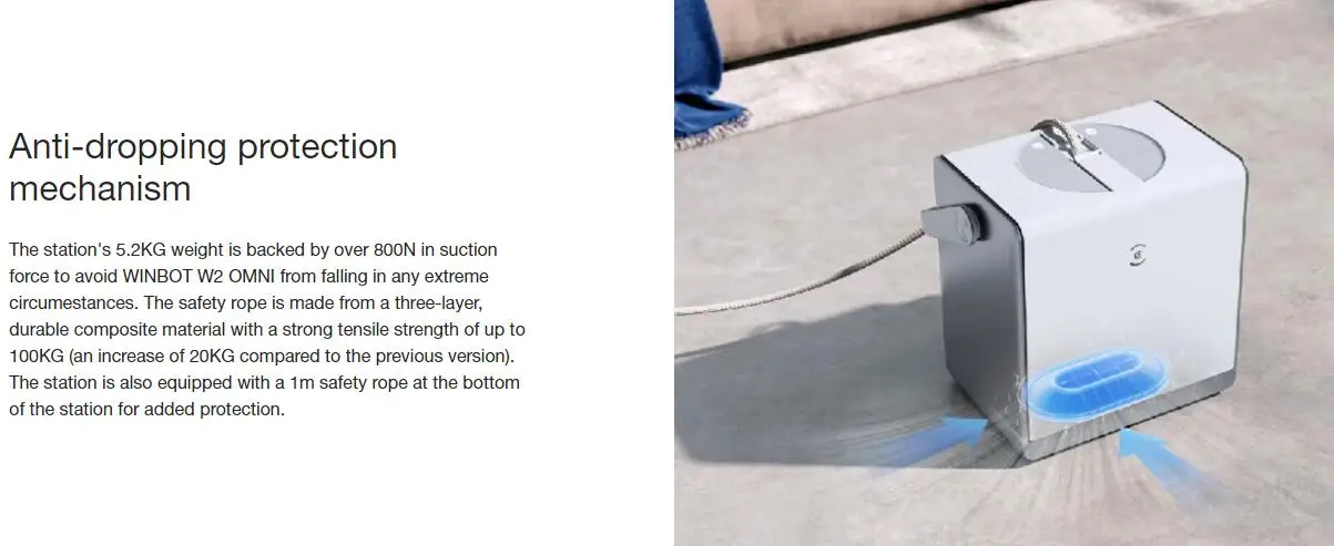 The station's 5.2KG weight is backed by over 800N in suction force to avoid WINBOT W2 OMNI from falling in any extreme circumestances. The safety rope is made from a three-layer, durable composite material with a strong tensile strength of up to 100KG (an increase of 20KG compared to the previous version). The station is also equipped with a 1m safety rope at the bottom of the station for added protection.